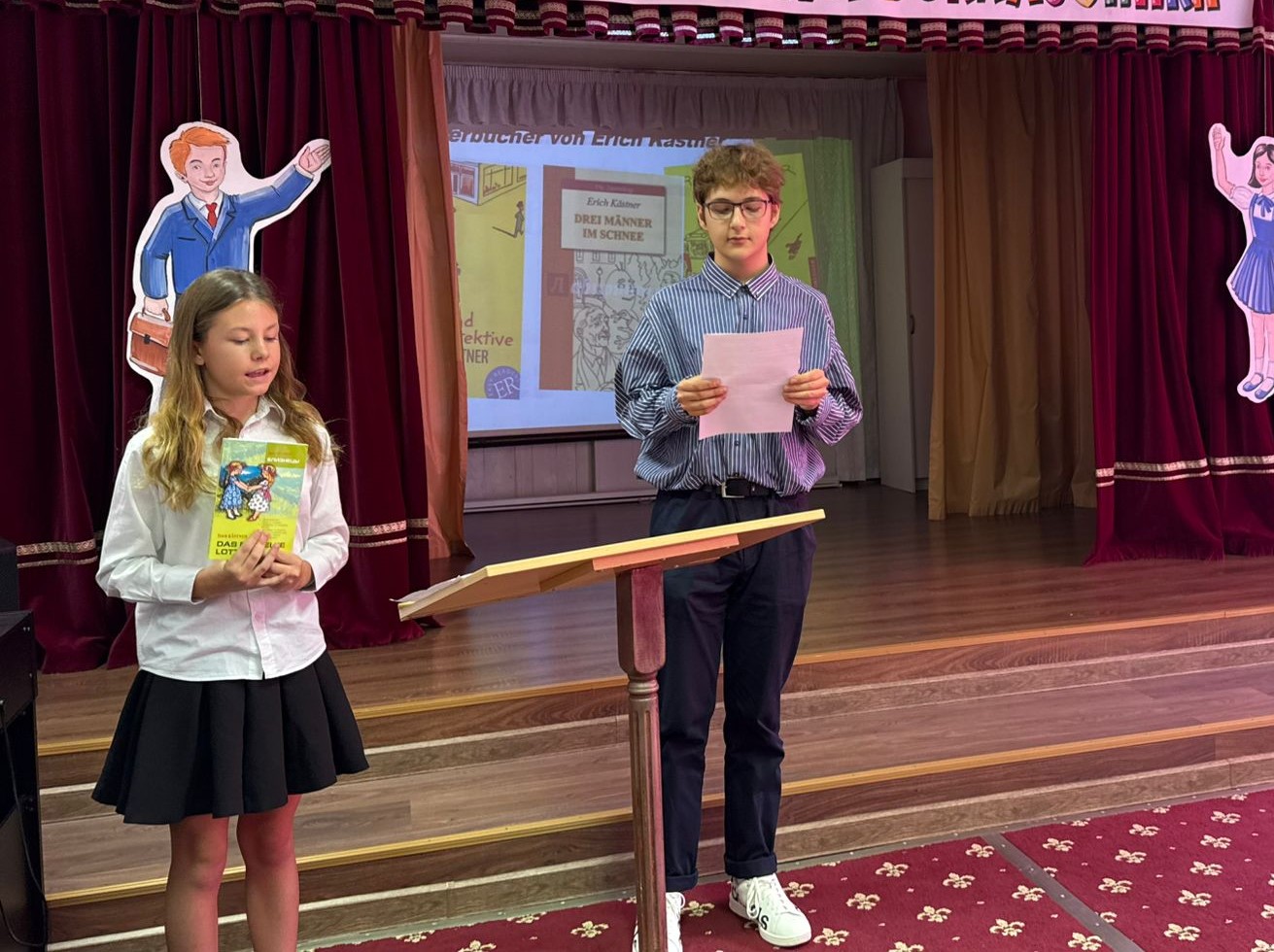 Герман участвует в читательской конференции на иностранных языках: переводит на английский язык впечатления от прочитанной книги на немецком языке "Das doppelte Lottchen"