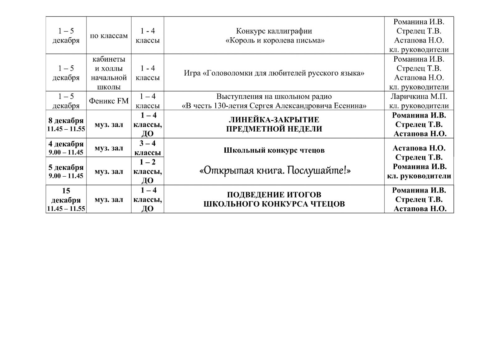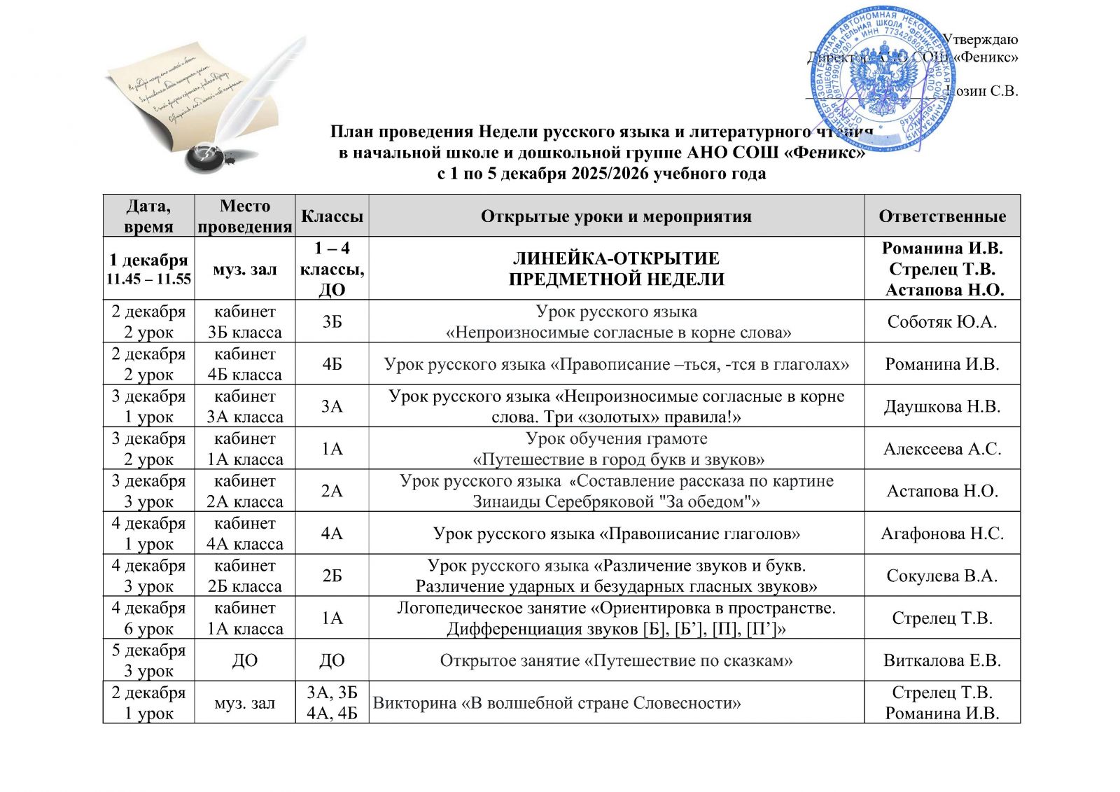 План проведения Недели русского языка и литературного чтения в начальной школе и дошкольной группе АНО СОШ «Феникс»
