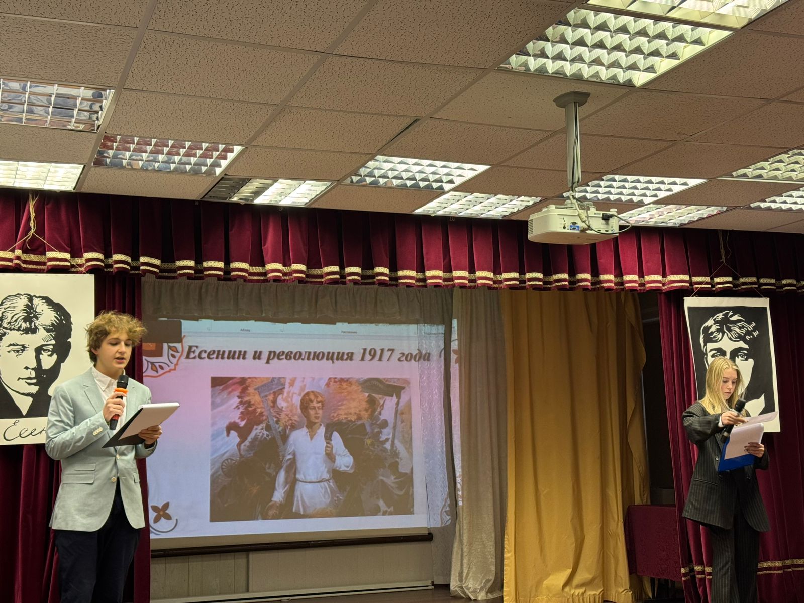 Встречу открыли ведущие, ученики 11 А класса, которые напомнили гостям о короткой, но невероятно яркой жизни поэта, продлившейся всего 30 лет. «Есенин достиг звёздной ясности и чистоты в воспевании российских просторов», – прозвучали слова со сцены.