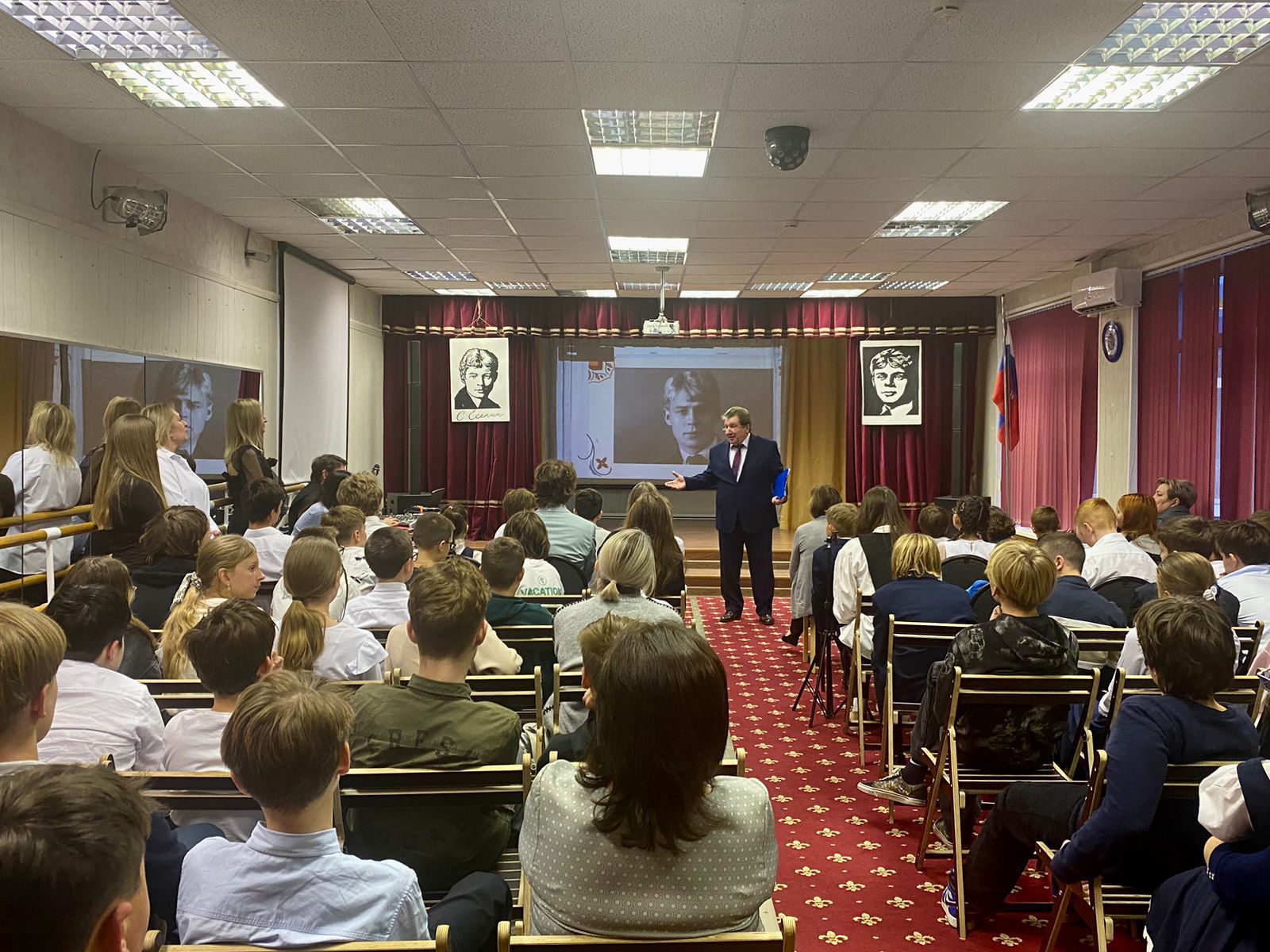 Музыкальная составляющая вечера добавила лиричности. В исполнении учеников и учителей прозвучали романсы на знаменитые стихи «Отговорила роща золотая...» и «Заметался пожар голубой…». А финальное слово взял Сергей Владимирович Козин, директор школы. Он признался в любви к творчеству Есенина и прочитал стихотворение «В этом мире я только прохожий...».