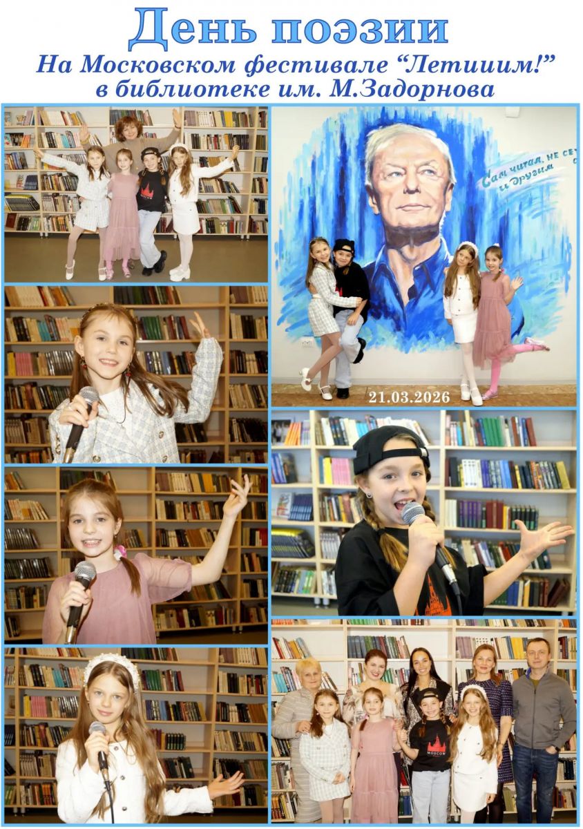 21 марта ученики 2А класса были приглашены для участия в Московском фестивале «Летииим!», посвященном Всемирному дню поэзии! Чтецы блестяще прочли произведения отечественной литературы и получили высокие оценки организаторов фестиваля. Событие состоялось в знаковом месте Москвы - библиотеке им. Михаила Задорнова. Благодарим руководителя чтецкой команды, учителя начальных классов, Астапову Нину Олеговну и родителей чтецов за помощь и участие в Московском фестивале!