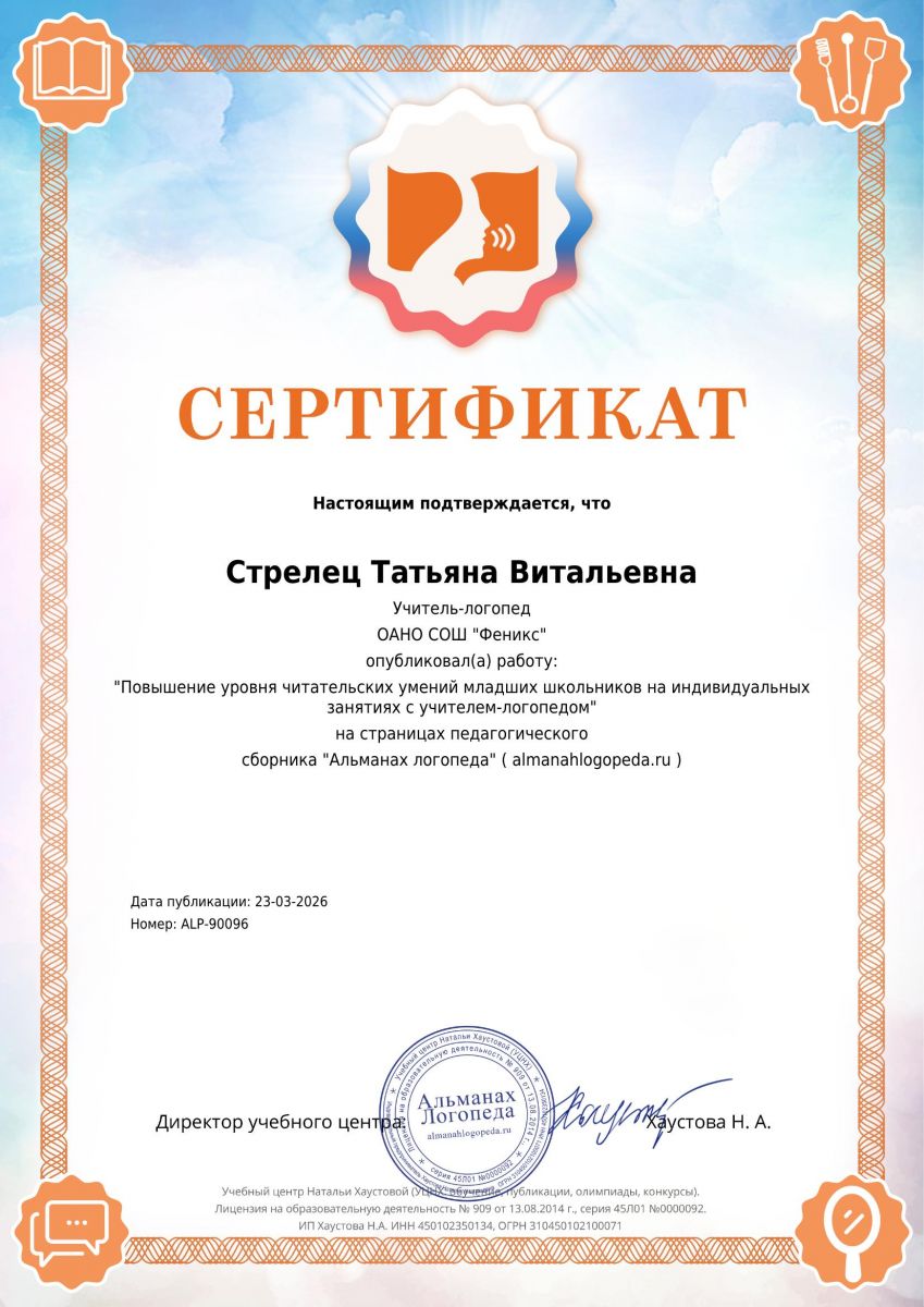 - Публикация статьи "Повышение уровня читательских умений младших школьников на индивидуальных занятиях с учителем-логопедом" в периодическом сборнике "Альманах логопеда", 23.03.2026.